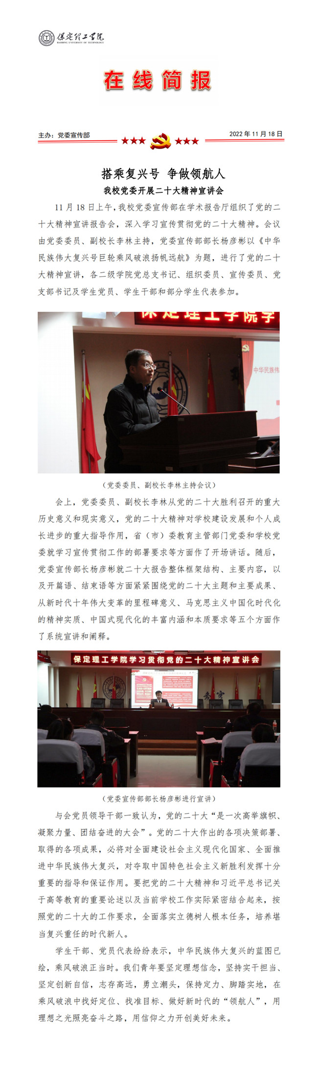 文章导读:为深入学习贯彻党的二十大精神,认真落实中央、省部委以及教育主管部门部署要求。12月4日下午,中共AC米兰中文官方网站委员会组织召开学习贯彻党的二十大精神线上宣讲会,党委书记王景明以《全面学习党的二十大精神推动保定理......