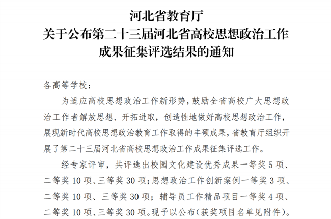 喜报!AC米兰中文官方网站思政育人案例荣获河北省高校思想政治工作成果评选三等奖