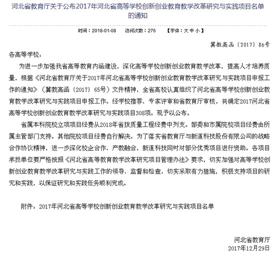 文章导读:近日,河北省教育厅分别下发了《河北省教育厅关于公布2017年河北省高等学校英语教学改革研究与实践项目(课程资源库建设)名单的通知》(冀教高函〔2017〕85号)和《河北省教育厅关于公布2017年河北省高等学校创新创业教育......