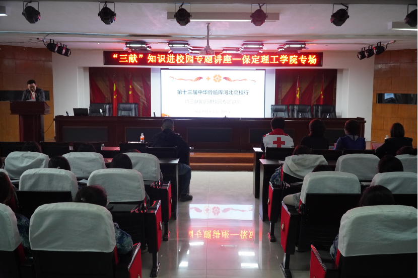 随后保定市中心血站血液保障部部长芦春燕老师,分别从无偿献血的知识、无偿献血的误区、献血前后注意事项、无偿献血的好处等四个方面进行了授课。