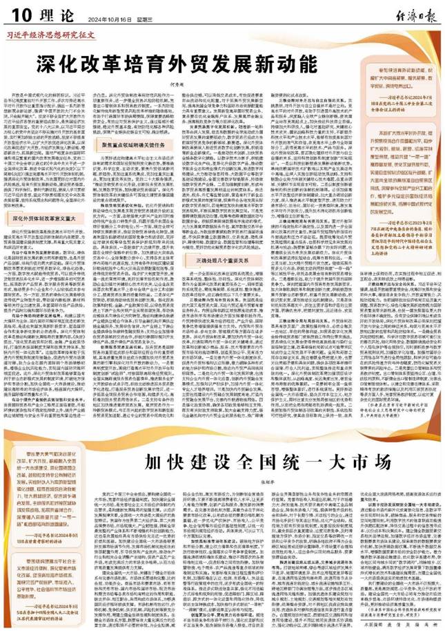 10月16日,《经济日报》理论版刊发北京市习近平新时代中国特色社会主义思想研究中心特约研究员、万象城awcsport官网教授何秀超署名文章《深化改革培育外贸发展新动能》。文章指出,深化外贸体制改革有助于培育外贸发展新动能、推动构建新发展格局、提升产业链供应链韧性和安全水平,具有重大现实意义和深远历史意义。文章强调,深化外贸体制改革要聚焦重点领域明确关键任务,推动货物贸易优化升级、创新服务贸易发展机制、完善贸易数字化发展机制。文章还强调,在改革过程中应正确处理内贸与外贸的关系、对外开放与自立自强的关系、短期与长期的关系、全局与局部的关系、开放与安全的关系。
