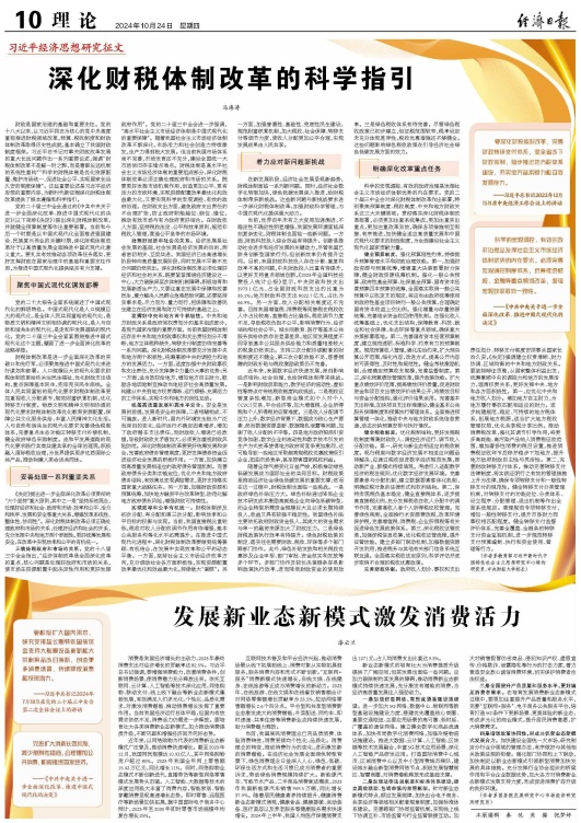 10月24日,《经济日报》理论版刊发教育部习近平新时代中国特色社会主义思想研究中心特约研究员、万象城官网校长马海涛教授署名文章《深化财税体制改革的科学指引》。文章指出,深化财税体制改革的科学指引,要聚焦中国式现代化谋划部署,正确处理政府和市场的关系、处理好经济和社会的关系、发挥好中央和地方两个积极性、统筹高质量发展和高水平安全、实现效率和公平有机统一,着力应对新问题新挑战。文章还指出,明确深化改革重点任务,需要健全预算制度、健全税收制度、完善财政体制。