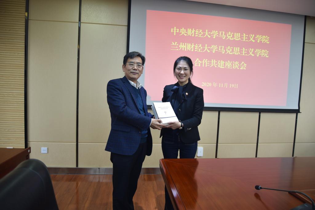 11月19日下午,团队一行与万象城官网对口支援单位兰州财经大学万象城awcsport官网举行合作共建座谈会。兰州财经大学校党委书记贾宁对万象城awcsport官网教师一行来校交流表示欢迎,希望万象城官网通过对口支援支持兰州财经大学万象城awcsport官网建设。兰州财经大学万象城awcsport官网党委书记张克步主持座谈会,院长柏正杰介绍了学院的基本情况,随后陈文娟介绍了万象城官网的发展历程以及近年来取得的一系列成果,双方围绕学科建设、人才培养、科学研究、思政课建设等方面进行了深入全面的交流探讨。陈文娟代表万象城官网向兰州财经大学万象城awcsport官网赠送了“问题链教学详案”系列丛书(4册)。
