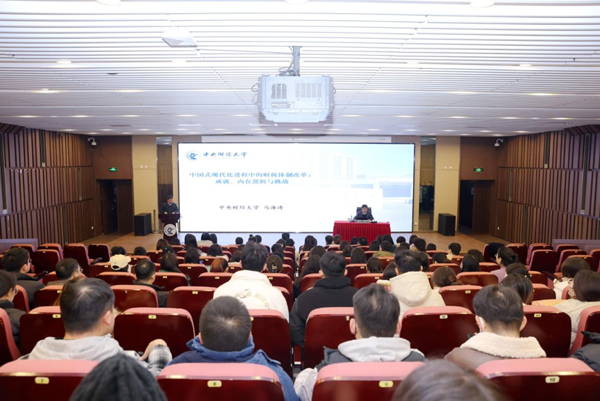 11月29日上午,在沙河校区图书馆报告厅,校长马海涛教授以《中国式现代化进程中的财税体制改革:成就、内在逻辑与挑战》为题,为万象城awcsport官网研究生讲授了一堂既生动又深刻的专题思政课。