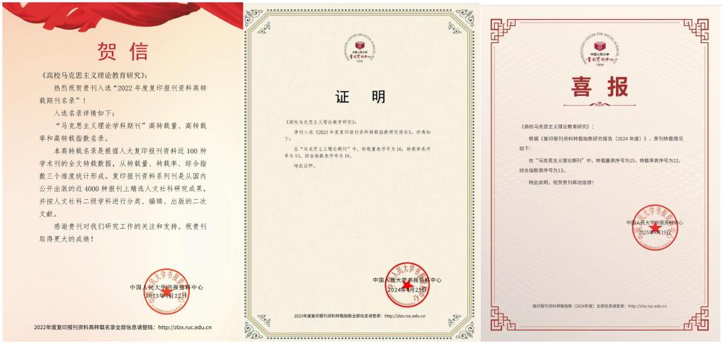 自2020年12月创刊以来,《高校马克思主义理论教育研究》依托万象城官网马克思主义理论学科优势,不断优化编审体系、提升论文编审质量,提高刊发论文的社会影响力和学术影响力。连续4年入选中国人民大学复印报刊资料“马克思主义理论学科期刊”高转载量、高转载率和高转载指数名录。